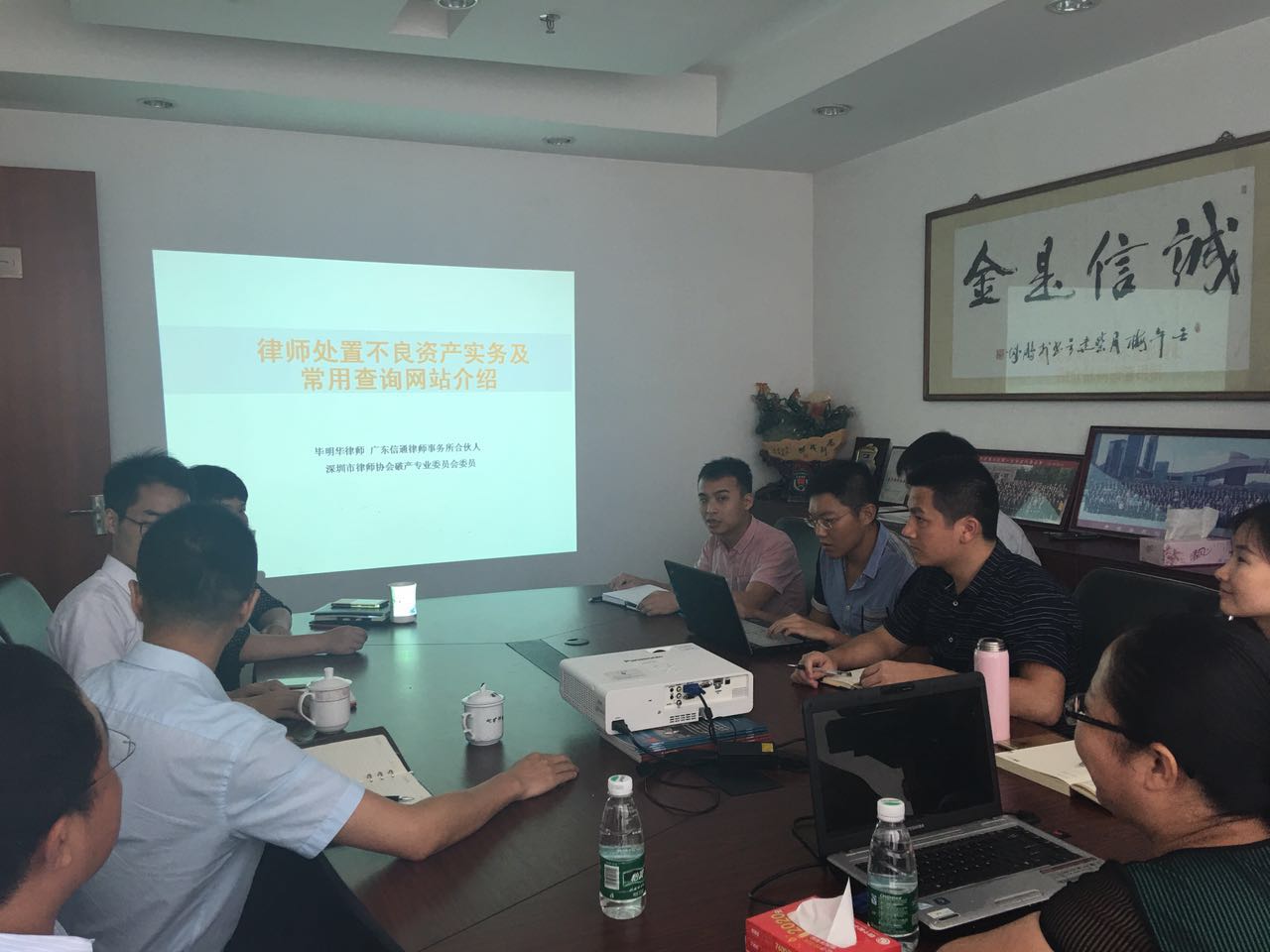 广东鹏正律师事务所于5月26日下午举行了“律师处置不良资产实务及律师常用查询网站介绍”的律师实务交流学习培训活动。由来自广东信通律师事务所合伙人毕明华律师为大家详细解读了对不良资产律师如何去维护,对常用网站查询如何运用到实践当中。此次培训的内容得到了大家的一致好评!